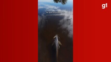Imagens de drone mostram boto que aparenta seguir embarcações e capturar peixe solto em segundos no trecho raso do Rio…